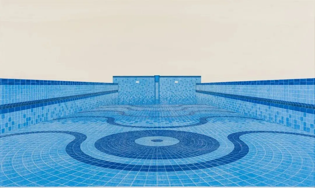 尽管作品名为《站在远方的你:布达佩斯(三)》(You come to me on a summer breeze–Budapest 3 ,2024–2025),其创作契机却源于一次冬季的匈牙利布达佩斯之旅。在寒冬时节,他参观了历史悠久的盖勒特温泉浴场(Gellért Thermal Bath)。当时浴场空无一人,池中亦无一滴水。这难得的宁静让他得以仔细观察池壁的瓷砖,留意其尺寸的细微差别,并回到工作室将这些观察细致入微地重现。整幅作品弥漫着深邃的蓝色调,探讨着“在场”与“缺席”的主题,引人遐想:是谁曾在此畅游,未来的泳者又将是谁?正是这些无形的身影,赋予空寂的泳池以生命力。