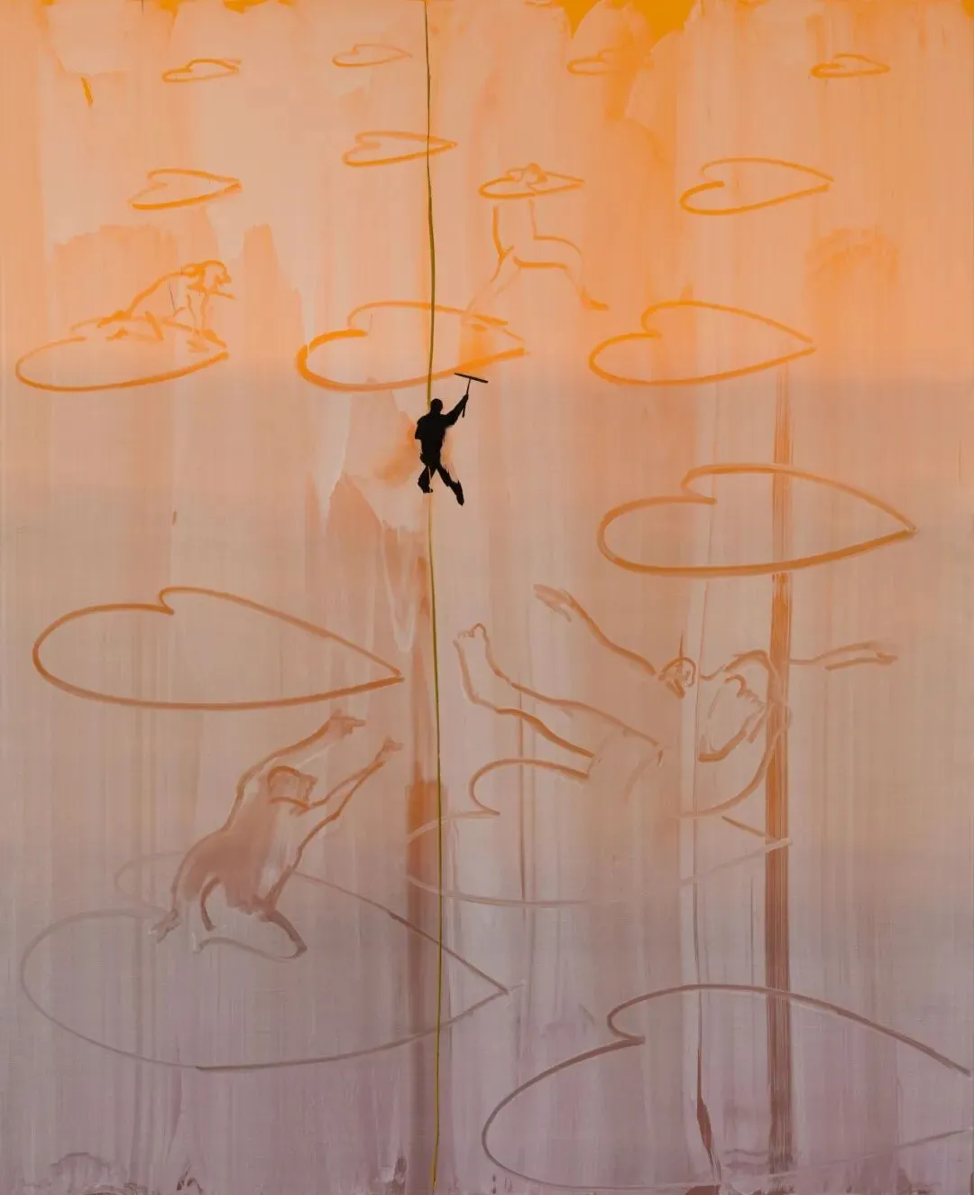 在《Squeegee Men (Hearts)》(2024)中,一个渺小的男性身影被绳索悬挂,手中握着刮刀,似乎正漫不经心地在一扇巨大的脏污窗户上涂抹心形图案。这幅画作极具喜剧性,却又十分犀利:那几道脏兮兮的粉色和橙色抽象色块,分明是在戏仿男性艺术大师马克·罗斯科(Mark Rothko)的色域绘画;而那个在窗户上刮擦的小人物,其动作又模仿了格哈德·里希特(Gerhard Richter)标志性的刮擦技法。艺术家借由一个孤立无援且身处险境的涂鸦者形象,来解构和嘲弄绘画创作的过程,以及那些被奉为圭臬的艺术抱负。而“心” ——这个最俗套的深情象征,却在一旁漠然飘浮。