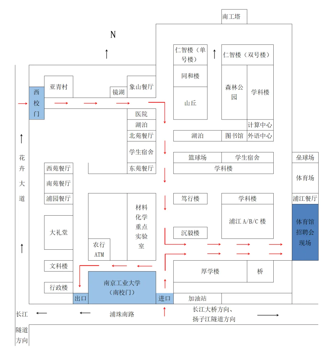 参会企业代表可乘坐公交、地铁或自驾到南京工业大学江浦校区,从南大门进入右转,按指示牌到体育馆。