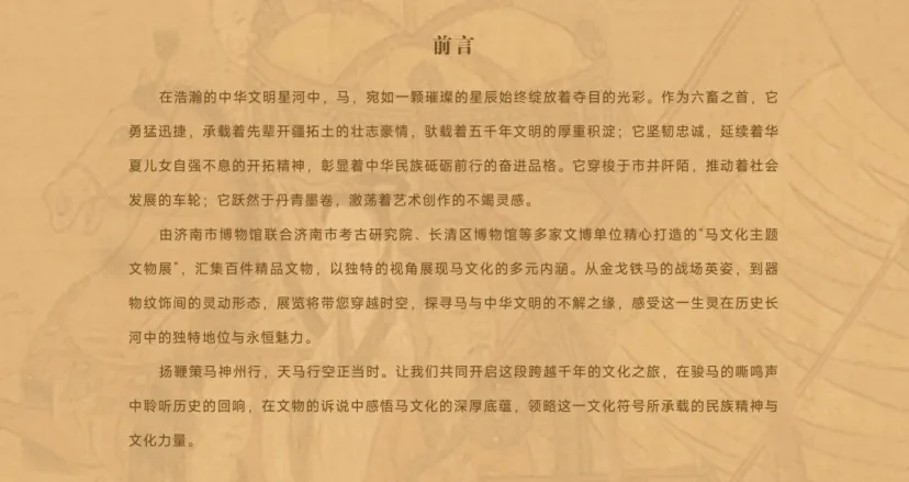 “骁腾有如此,万里可横行。”2026丙午马年,辞旧迎新之际,诚邀广大观众步入济南市博物馆,于骏马嘶鸣的历史回响中,于文物静默的文化沉淀里,领略马文化所凝聚的民族精神与文化力量,共赴一场跨越千年的文化之约。