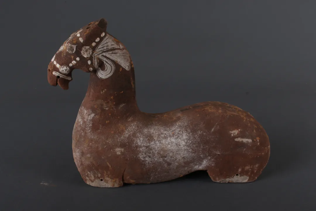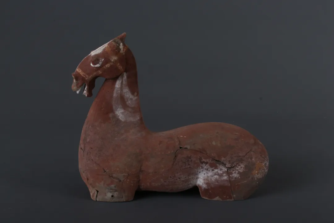 平阴西山墓地出土。通体施红彩,用白线勾画出马身上的佩件和饰品。马脸修长,眉骨高,眼窝深邃。马嘴张开,似在嘶鸣。身材健壮,挺胸曲颈,肌肉发达,呈现奔放雄硕气势。