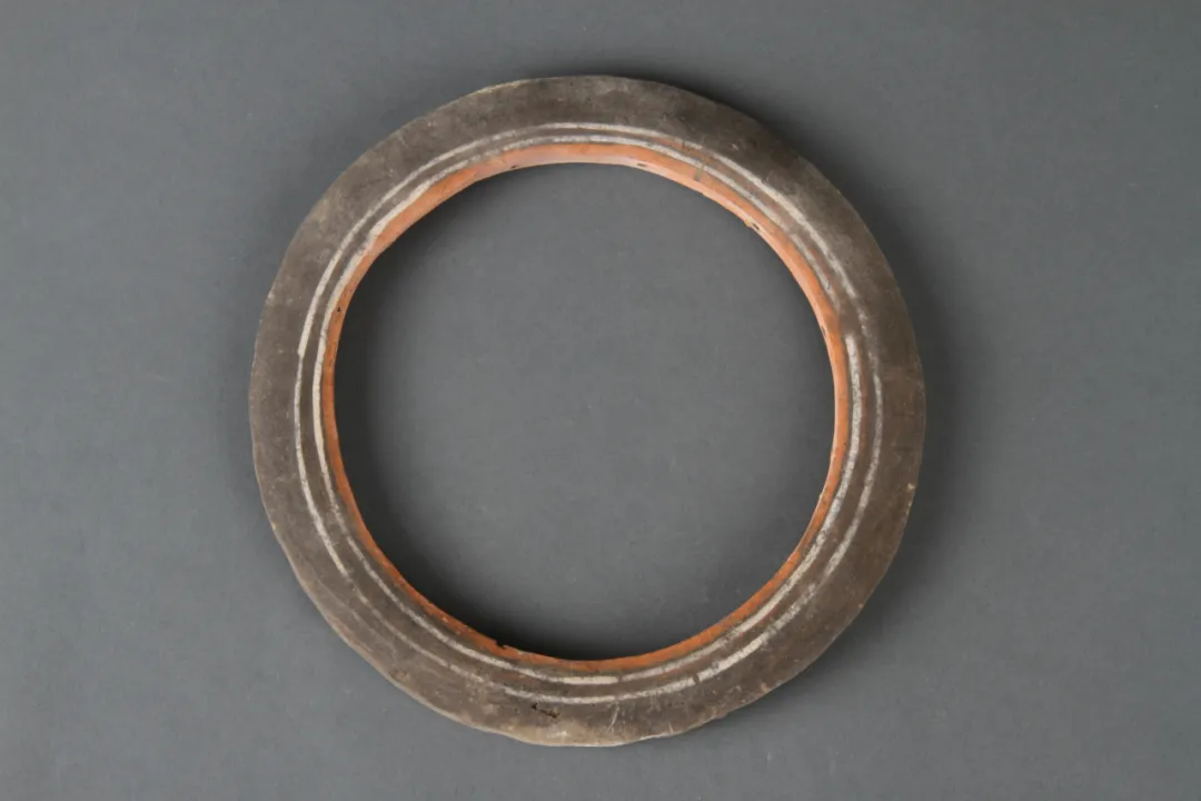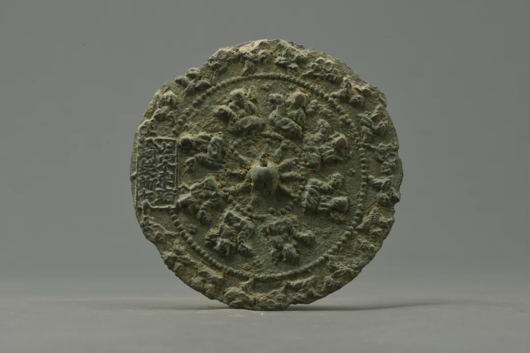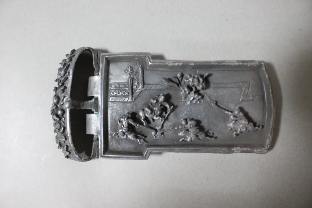 长清崮山宋墓出土。马球,古称“击鞠”,是骑在马上用球杆击球入门的一种运动。始于汉代,流行于唐宋时期,宋代的马球运动文献中记载较多,图像资料却极罕见。宋银带扣正面高浮雕打马球图,场地中有四人策马打球,形象地表现了宋代打马球的场景。扣环外侧还有高浮雕牡丹蹴鞠图,一儿童在牡丹丛中用右脚踢蹴鞠。背面是一幅芦雁图,整体栩栩如生。