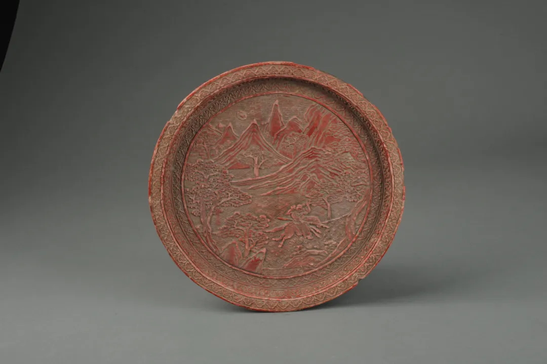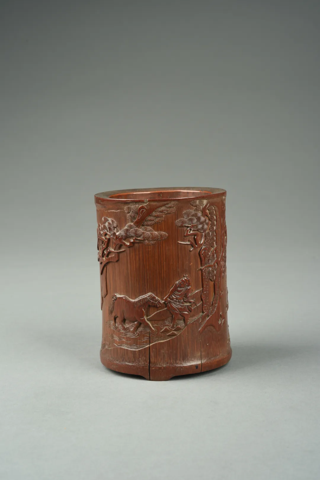 三级文物。竹质,棕色,直口。刻工精湛,浅浮雕山石、松林、溪流,并有一老者牵一马在溪流中蹚过,动作神态逼真,人物栩栩如生。