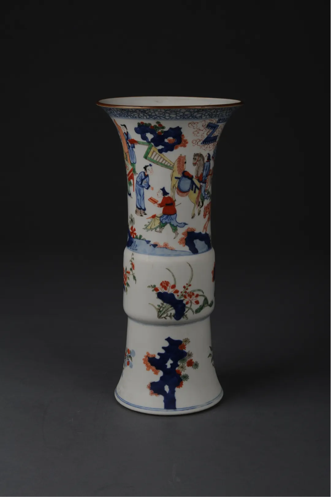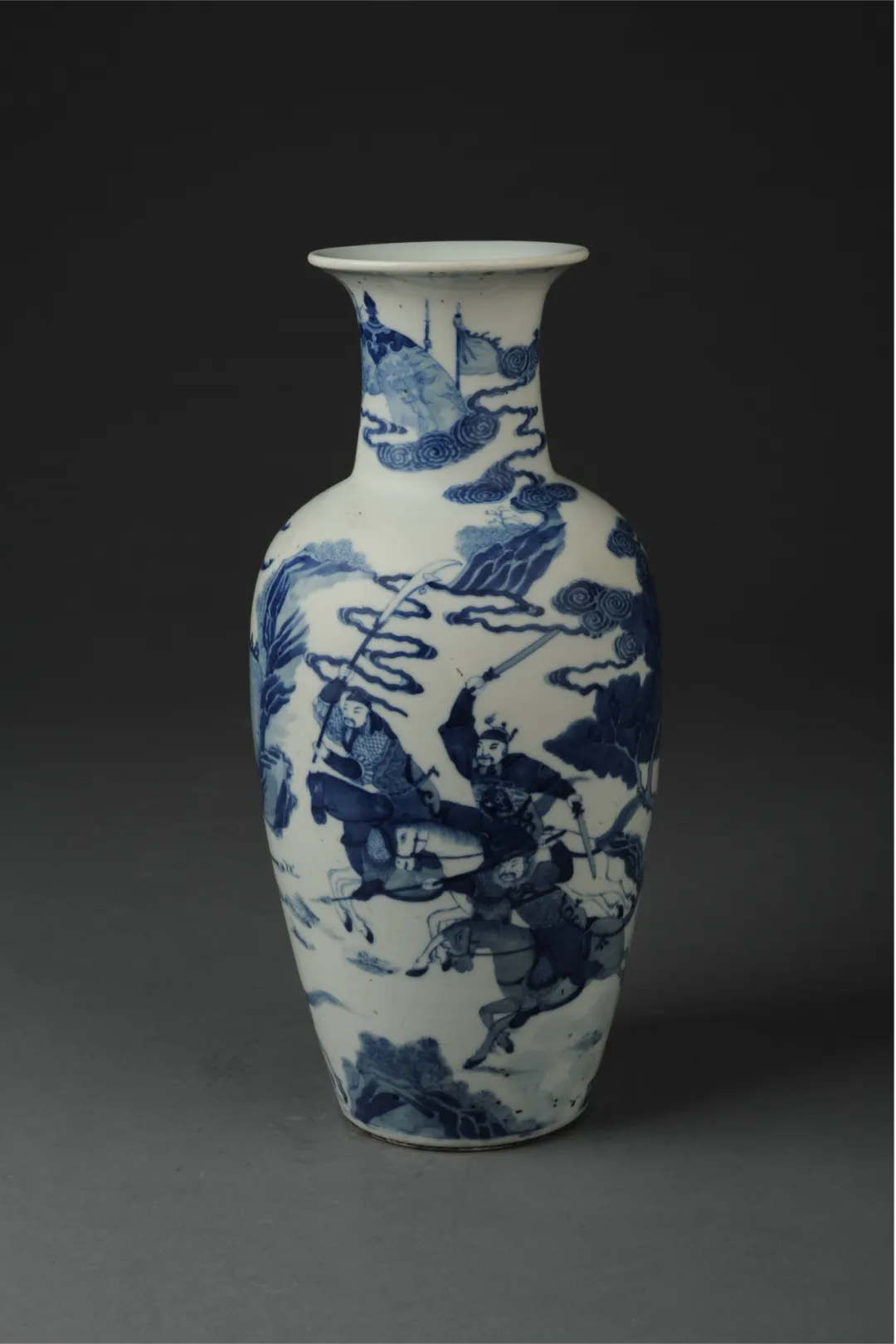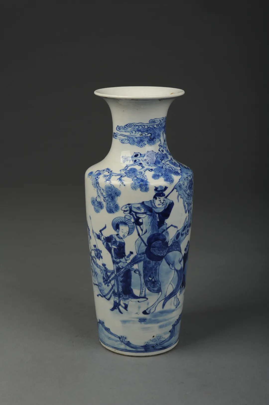 三级文物。器身绘山石旁,松树下一人骑马扛旗,一女子马下持弓。青花发色淡雅,纹饰层次丰富,整体营造出颇具故事性的画面,体现出古代工匠在青花绘制技艺上的娴熟。