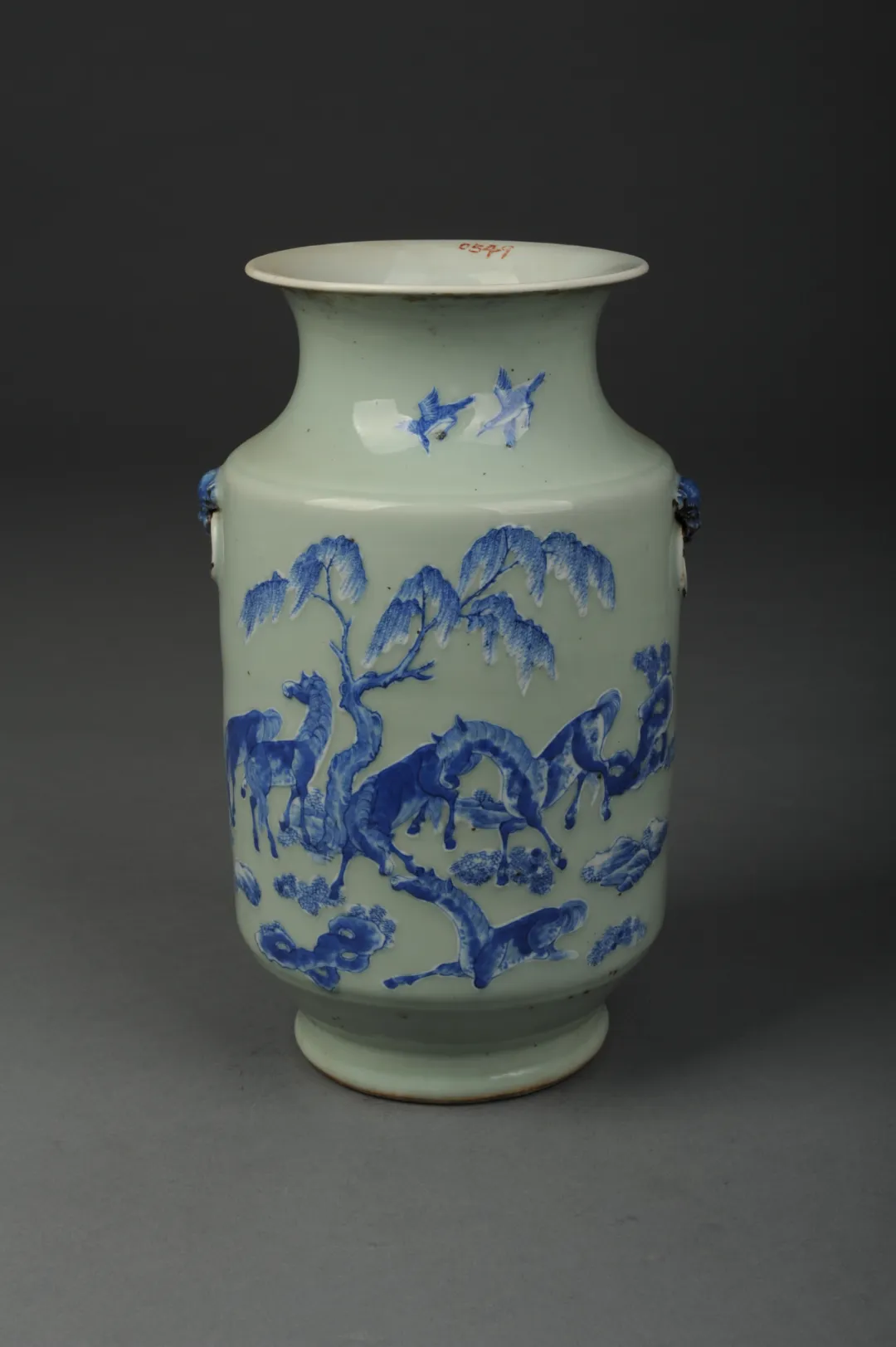 三级文物。豆青釉地。肩部堆贴双兽首环、足底施白釉。蓝釉绘饰柳树、草石、飞鸟及五匹马。