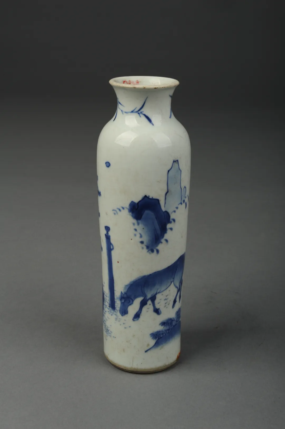 三级文物。器呈萝卜状,白釉闪青。颈绘兰草纹,腹部青花绘牧马图,绘山石、树木、草场,一人手持柳条牧马,马儿悠闲吃草。