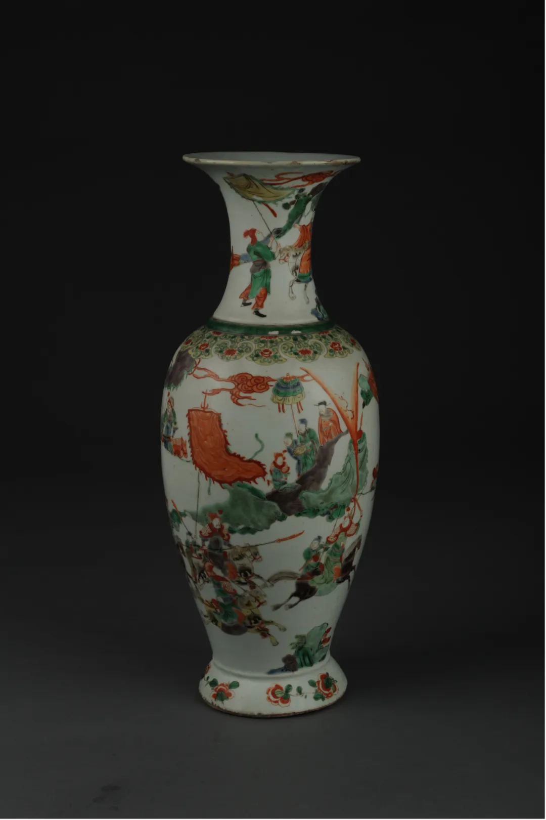 通体以五彩为饰,颈部和腹部饰刀马人物,形象生动,画工精湛;肩部暗刻一周连珠纹为饰,下方接一周如意云头纹,纹内饰以缠枝花卉纹;足底以淡描青花绘一片叶子为款,俗称“花押款”。