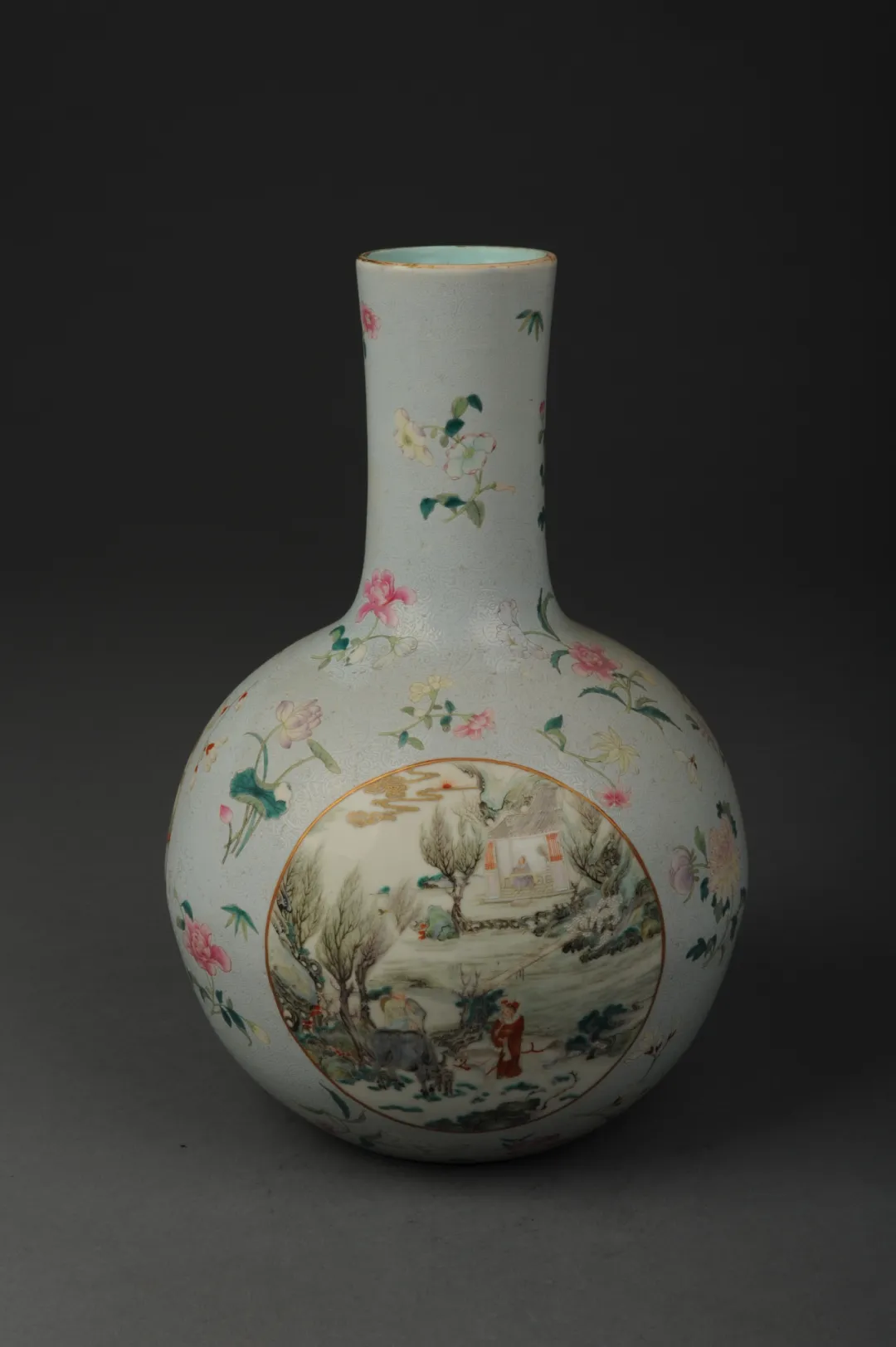 三级文物。器身淡蓝压道地,粉彩绘荷花、牡丹、玉兰花各种花纹,腹部两个圆形描金开光内为人物故事。底有“大清乾隆年制”金地红色图章刻款。