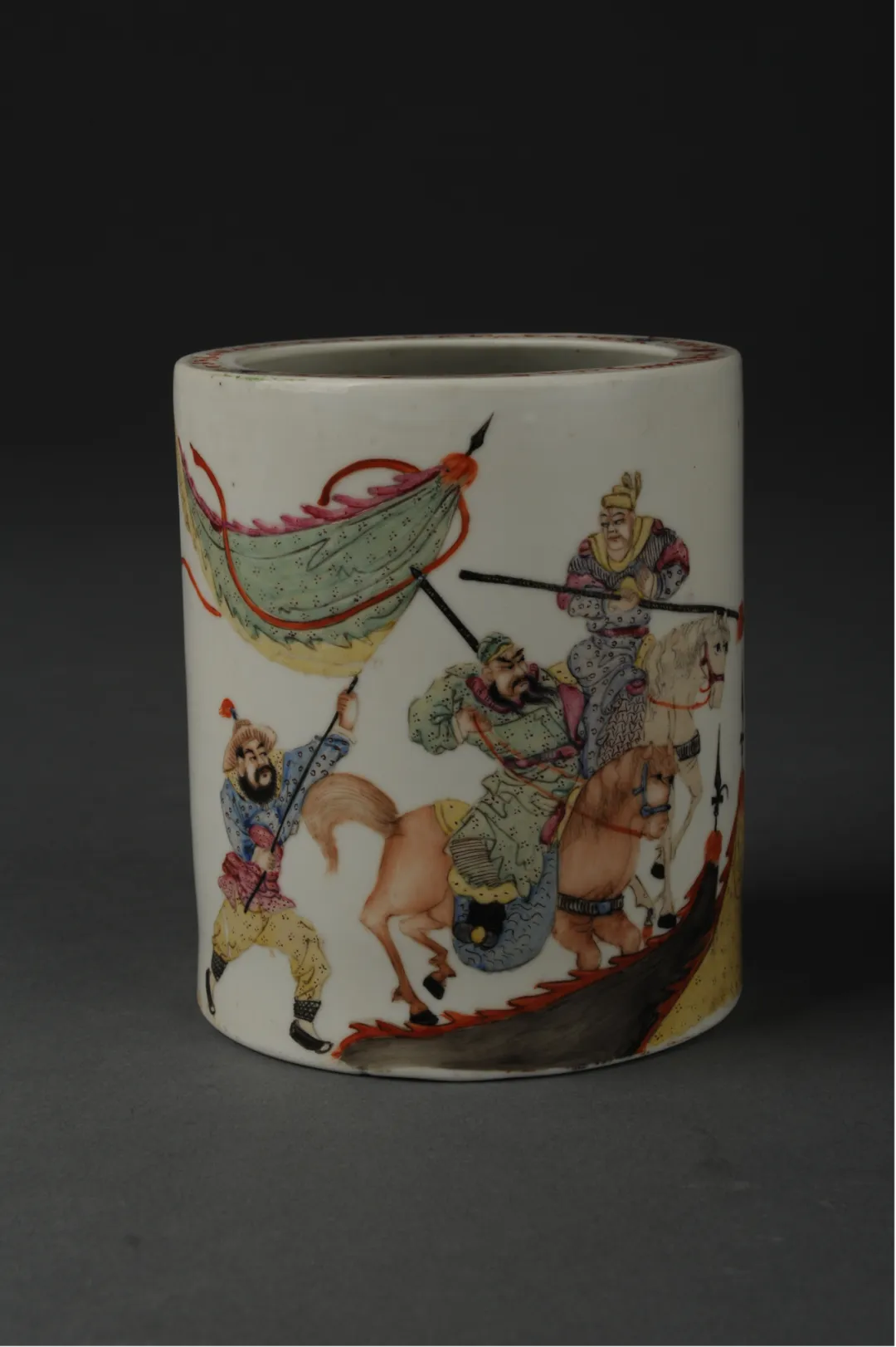 近现代仿乾隆粉彩刀马人物故事笔筒