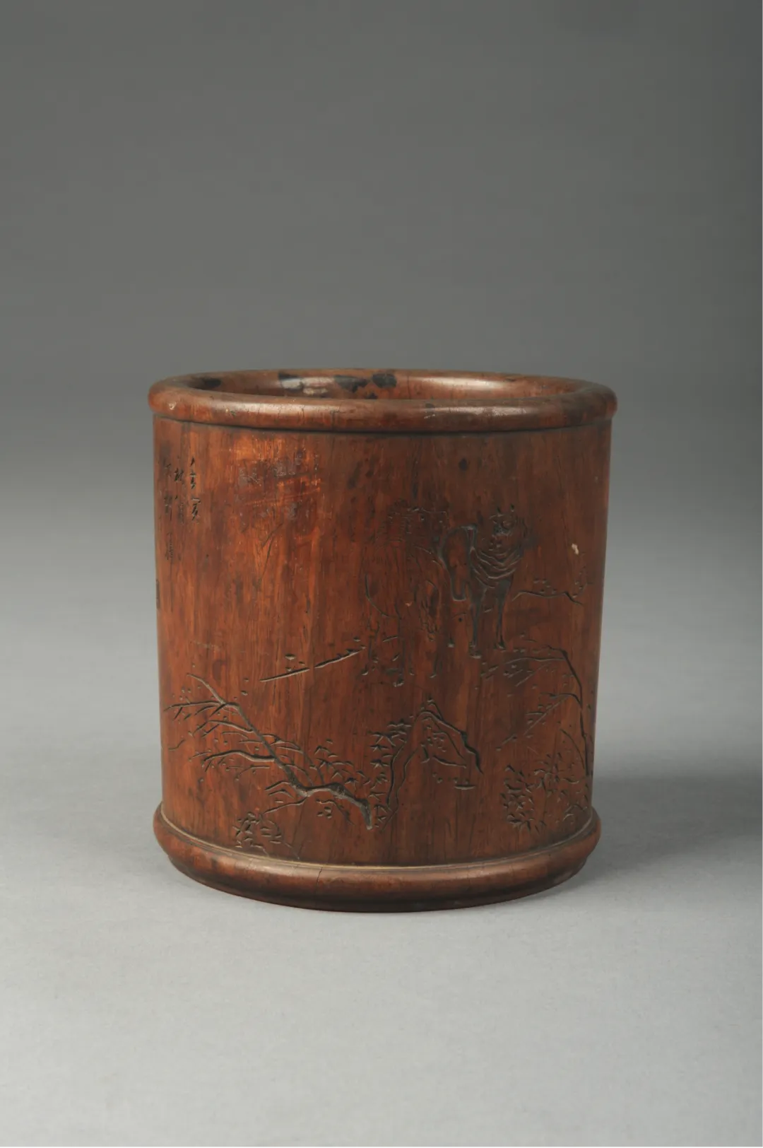 二级文物。笔筒周身阴刻两匹骏马相对而立,点缀坡石、草木,上刻题款“壬寅秋八月仿新罗山人法 小某王素”。