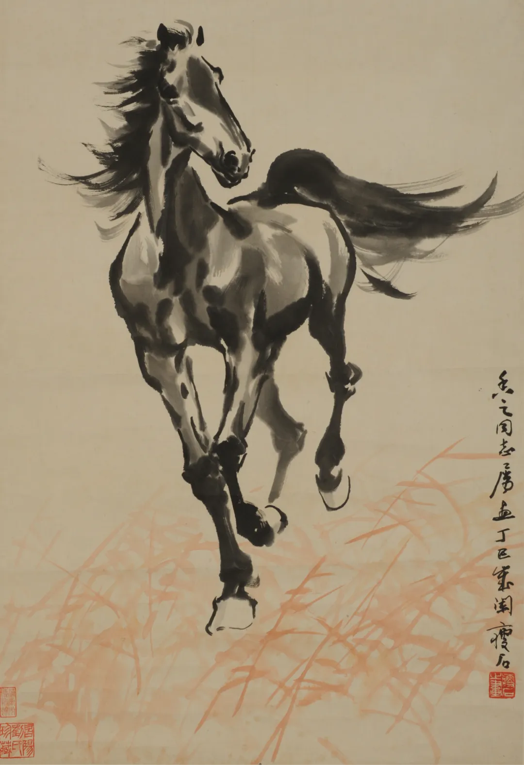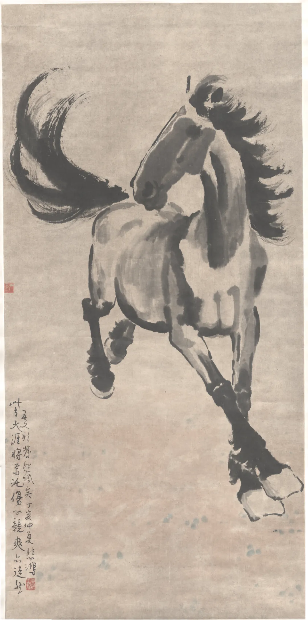 徐悲鸿(1895—1953),著名画家、美术教育家,被誉为“中国现代美术之父”。他早年留学欧洲,融合中西画法,尤其以画马闻名于世。画中的马昂首扬尾、四蹄腾空,姿态矫健奔放。