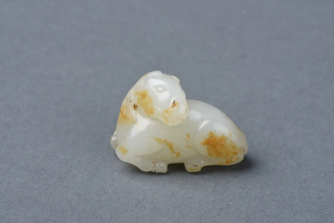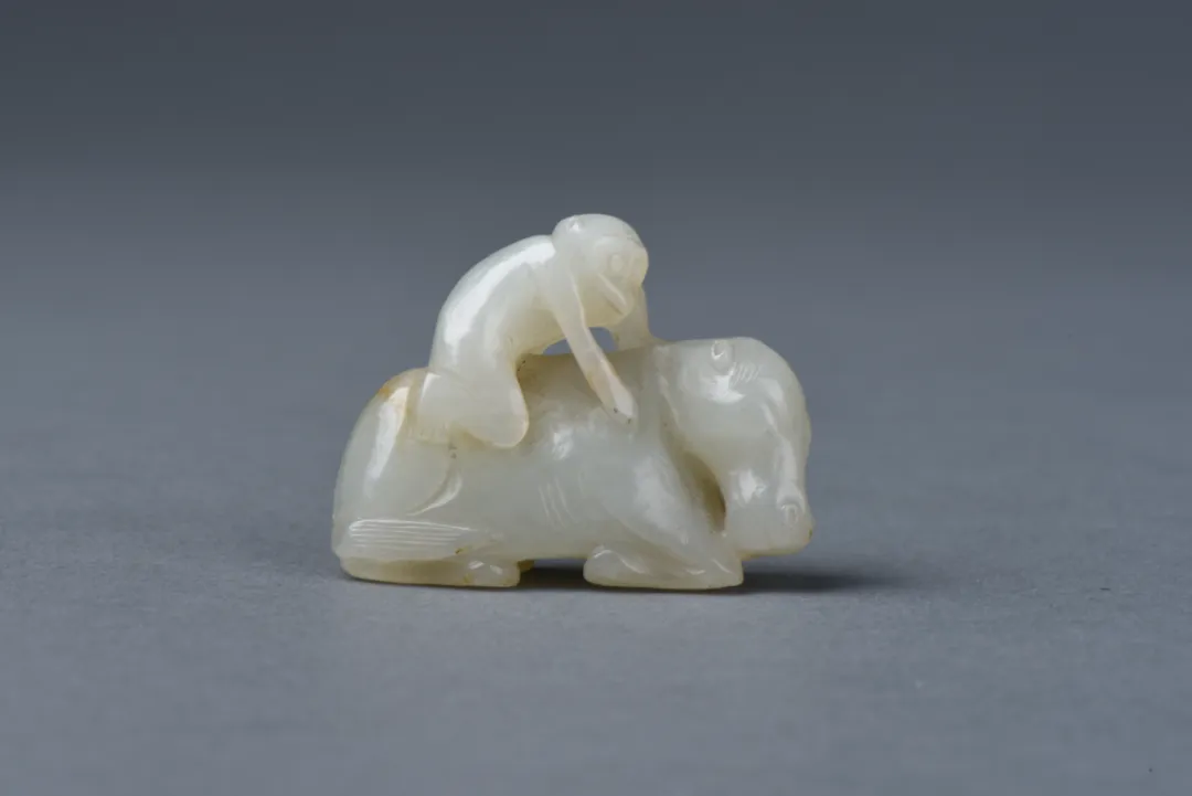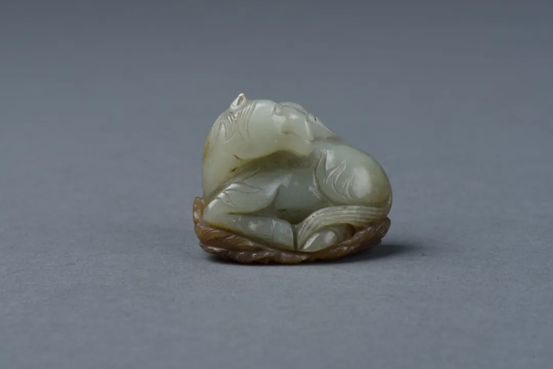 玉质青白,圆雕一马四肢伏地,背上驼有一猴。猴马的组合造型,寓意“马上封侯”,展现古人对仕途顺遂、加官晋爵的美好向往。