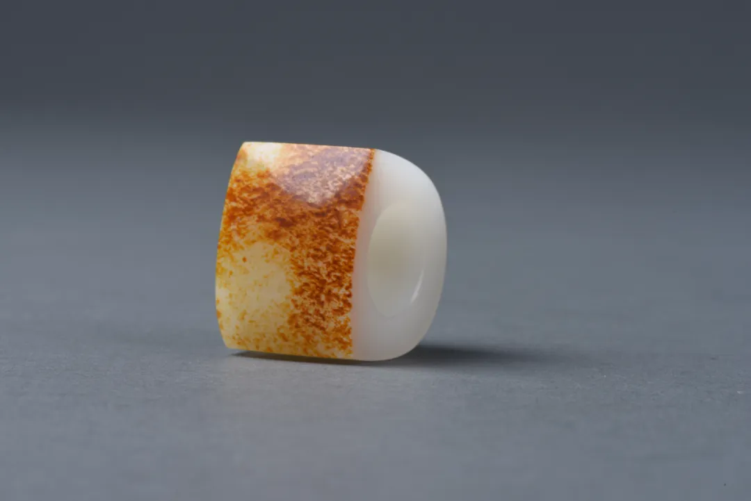 扳指外形呈马镫状,素面。白玉质,温润透明,表面保留黄褐色石皮,使器物更加古朴自然。