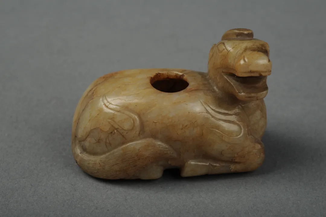 三级文物。水注,主要用于为砚台磨墨时添注清水。此水注玉质青白色,立体圆雕。马呈侧首卧状,张口露舌,菱形眼,尾弯曲紧贴后腿。马腹掏空,水注之口开于马背,腹中空可贮水。