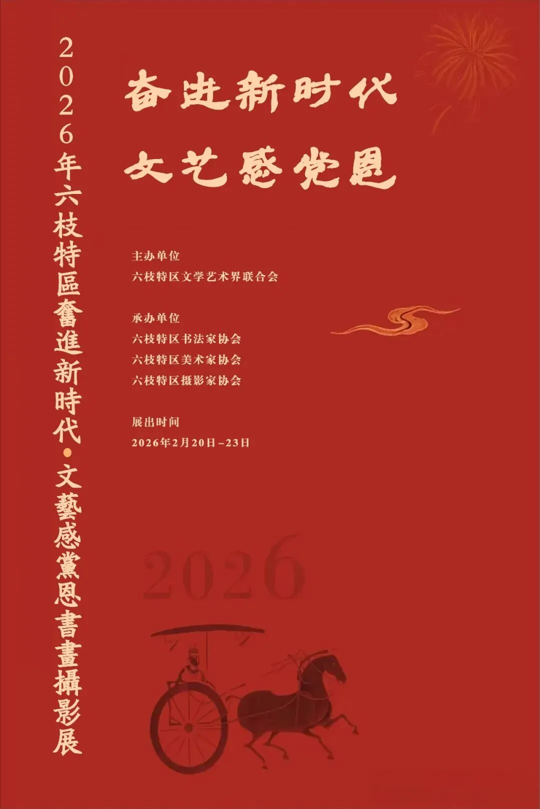 年年岁岁花香似,岁岁年年景不同。夜郎腹地,群英展翅迎春景;书画楼台,众友抒怀创未来。为丰富全区春节期间群众文化生活,在2026年春节期间,由六枝特区文学艺术界联合会主办,六枝特区书法家协会、六枝特区美术家协会、六枝摄影家协会联合承办的“奋进新时代·文艺感党恩”为主题的书画摄影作品展,在六枝特区三线文化产业园(原煤机厂内)展出,旨以笔墨描绘祖国大好河山,以镜头定格人间烟火,汇聚六枝本土书法绘画摄影之佳作,共同谱写新时代发展之篇章。本次展出70幅(其中邀请作品10幅)书法绘画摄影作品,立足六枝传统文化之根脉,既反映我区三线建设、文旅发展(包括文旅体活动赛事、非遗展示、民族民俗文化)、乡村振兴、文艺文创等方面领域的发展成果,以及六枝人民积极向上、奋发有为的‘六枝精神’,又紧扣新春欢乐祥和主题。愿观者于笔墨之间品赏艺术之美,于镜头之中感受美丽河山和国富民强之景,共赴一场书法绘画之妙笔,定格暖意浓浓的新春之欢喜,同迎马年,共贺新春。