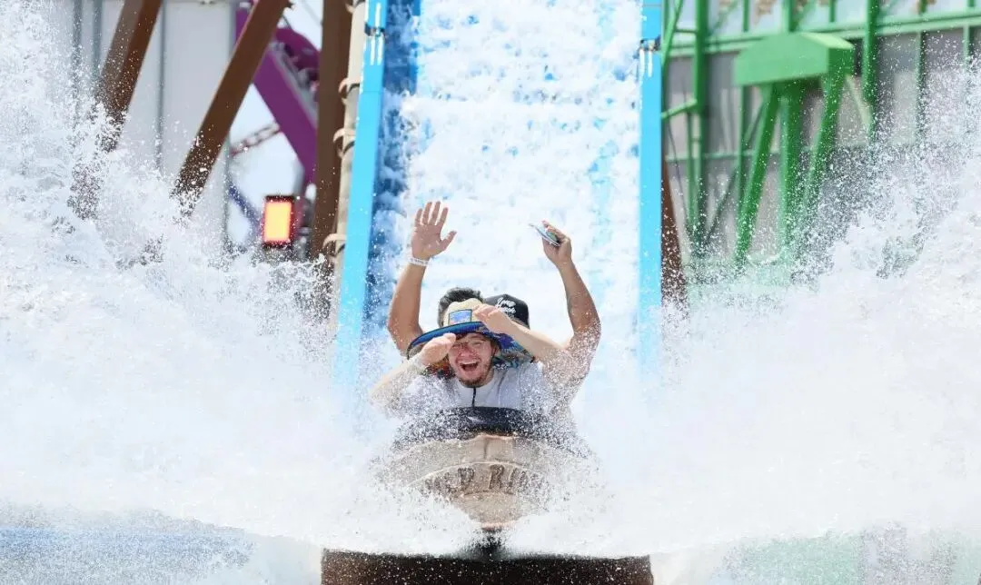 埃弗·阿吉拉尔(前)、乔希·皮纳温和埃里克·维尔斯科在2025年橙县嘉年华的“狂野河流”游乐设施上溅落水花。