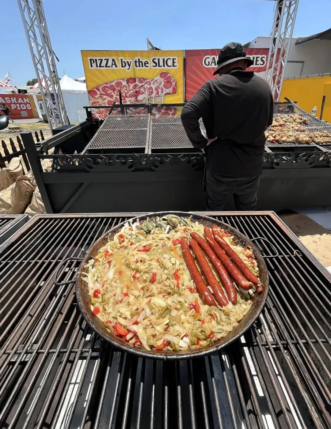 在2025年第135届橙县嘉年华开幕日,一英尺长的香肠在洋葱床上烹制。