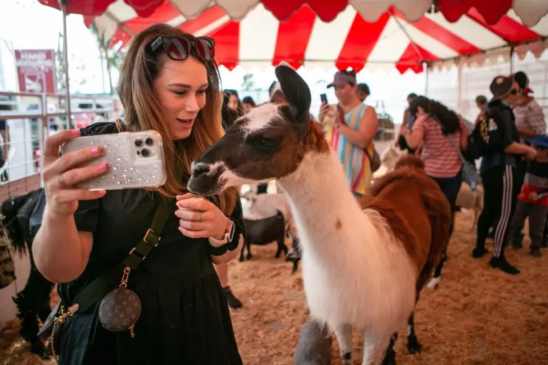 2021年橙县博览会上,一名游客正在宠物动物园游玩。