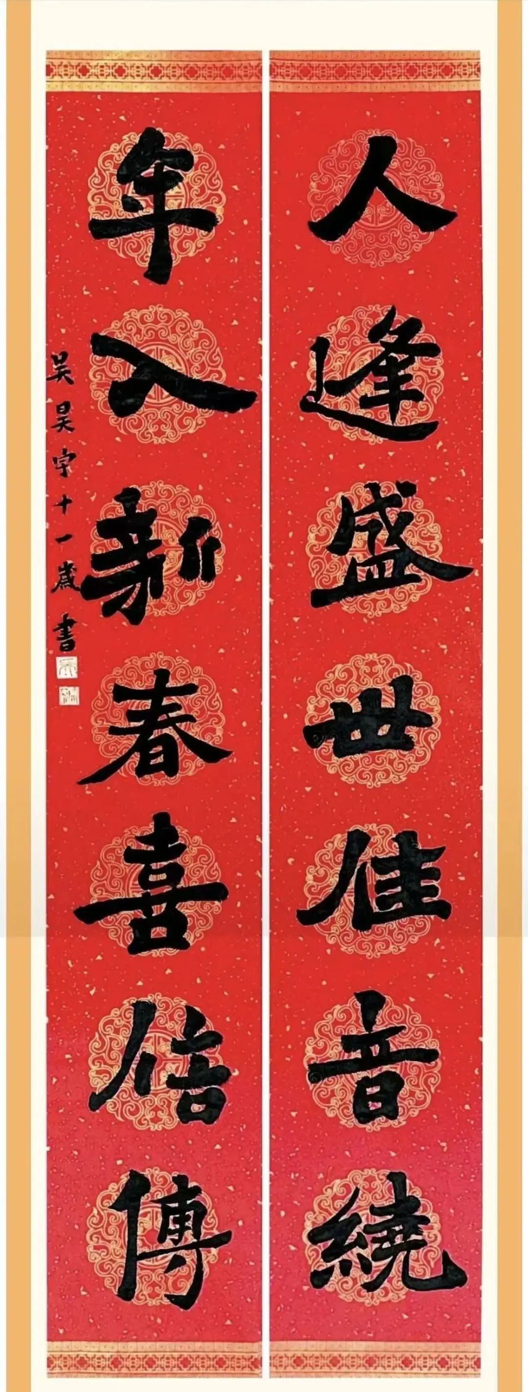 ▲吴昊宇,11岁,《对联一幅》,软笔书法