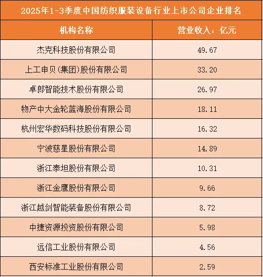 根据申万行业分类,2025年1-3季度中国纺织服装设备行业上市公司按营业收入排名如下:(A股上市公司)