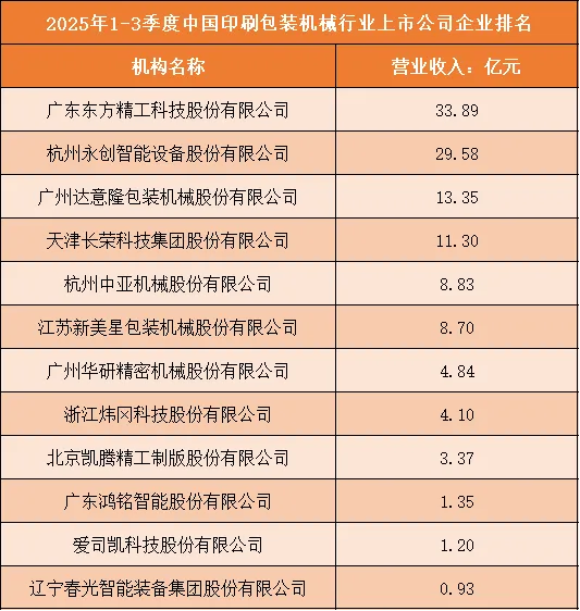 根据申万行业分类,2025年1-3季度中国印刷包装机械行业上市公司按营业收入排名如下:(A股上市公司)