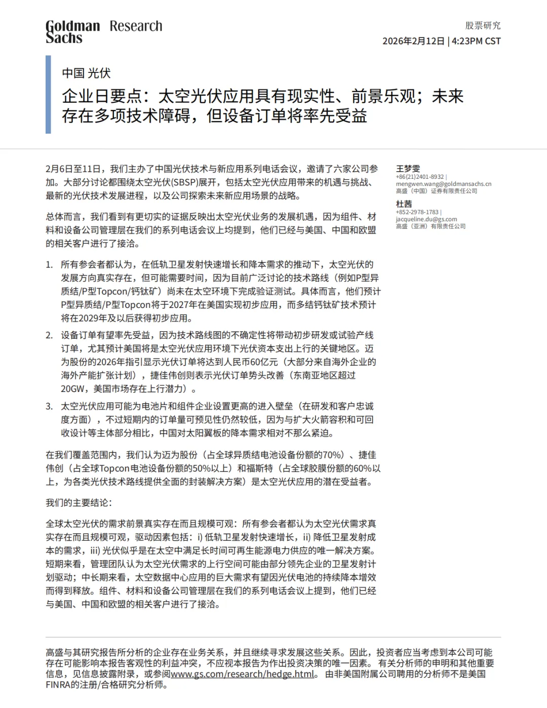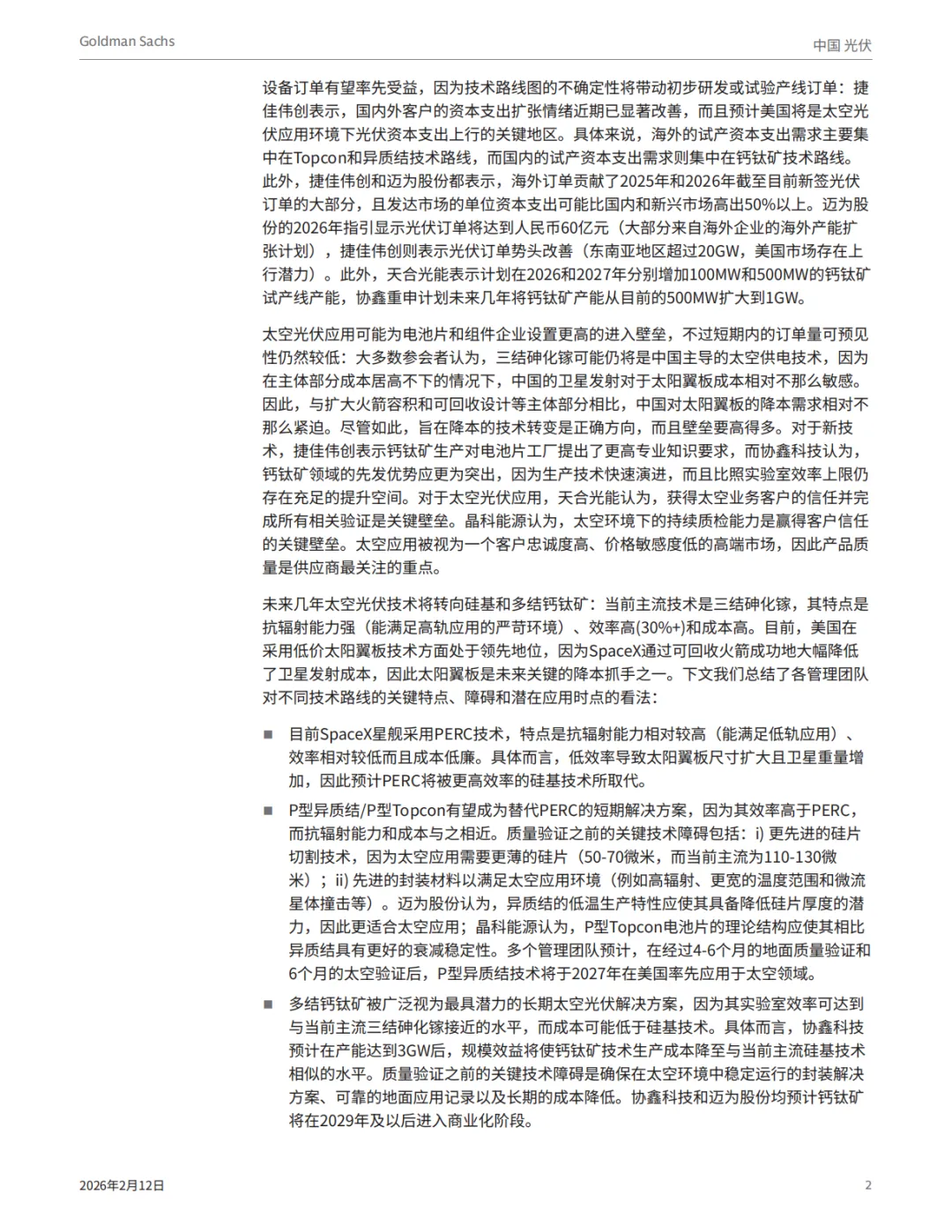 本期文章:『研报』高盛-中国光伏行业企业日要点:太空光伏应用具有现实性、前景乐观;未来存在多项技术障碍,但设备订单将率先受益 『研报』电力生产行业2025年信用回顾与2026年展望 以下正文: