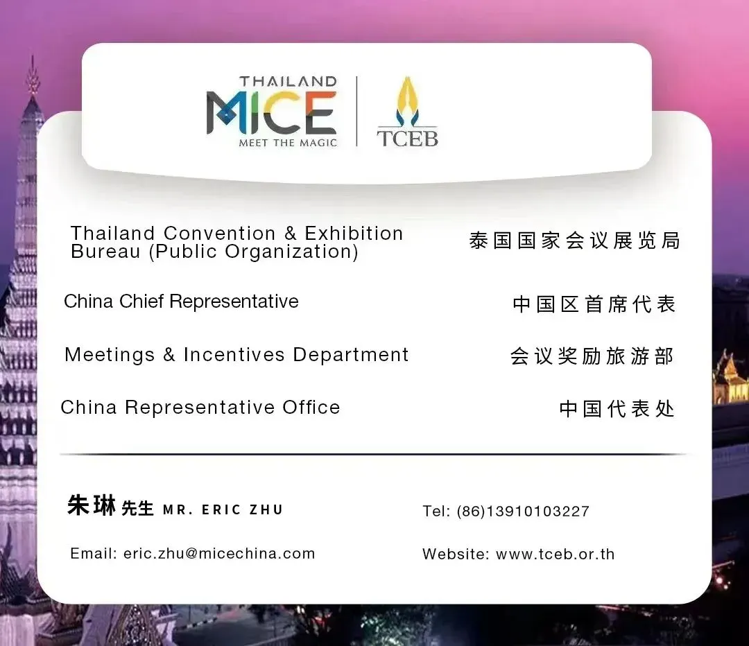如需进一步信息,请访问www.tceb.or.th您还可以联系泰国国家会展局中国代表处,联系方式如下: