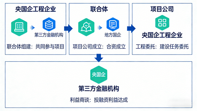 央国企工程企业会引入一个第三方金融机构,共同作为联合体参与项目;联合体与地方国企合资成立项目公司,项目公司将工程建设任务委托给央国企工程企业;第三方金融机构的投融资利益一般由央国企与第三方金融机构商谈后达成。