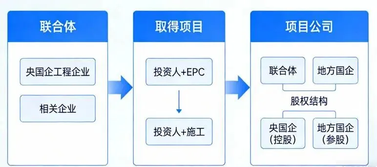 央国企工程企业以投资人+工程建设身份介入,通过“投资人+EPC”、“投资人+施工”等方式取得项目,央国企工程企业与地方国企出资成立项目公司,其中央国企以小比例参股,地方国企控股,项目公司与央国企签订工程建设合同。