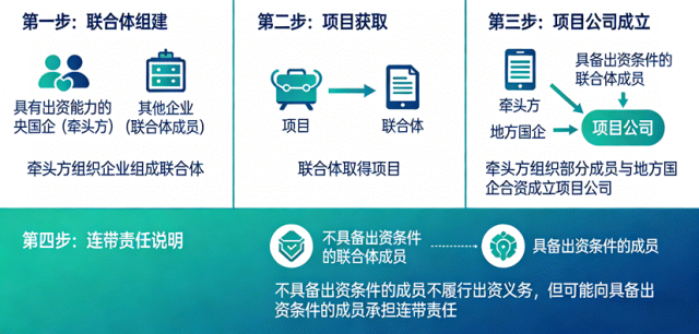 具有出资能力的央国企作为联合体牵头方,组织企业组成联合体,取得项目;联合体牵头方组织联合体中具备出资条件的部分成员与地方国企合资成立项目公司;联合体中不具备出资条件的联合体成员,虽然不履行项目公司出资义务,但可能需要向联合体中具备出资条件的合作伙伴承担连带责任。
