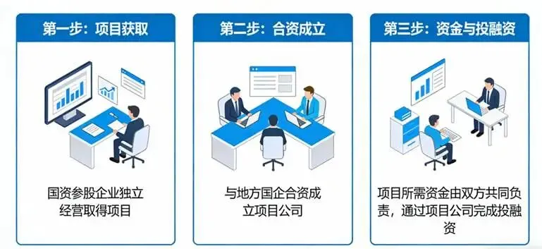 国资参股企业独立经营取得项目,与地方国企合资成立项目公司;项目所需资金由国资参股企业和地方国企共同负责,双方通过项目公司完成投融资。