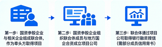 国资参股企业作为联合体牵头方,与相关企业组成联合体(常规情况下,联合体成员包括央国企),通过经营取得项目。取得项目后,国资参股企业组织联合体成员与地方国企合资成立项目公司;向银行申请融资授信时,央国企参股企业可能需要联合体中的部分央国企成员方信誉背书。