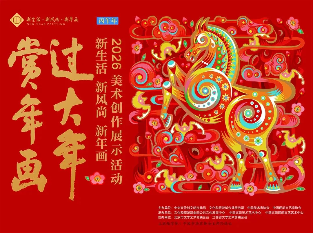 2026年“新生活・新风尚・新年画”艺术展由中央宣传部文明实践局、文化和旅游部公共服务司、中国美术家协会、中国民间文艺家协会共同主办,文化和旅游部全国公共文化发展中心、中国文联美术艺术中心、中国文联民间文艺艺术中心承办,北京市文学艺术界联合会、江西省文学艺术界联合会协办。活动以习近平新时代中国特色社会主义思想为指导,旨在以年画艺术激活传统节日文化内涵,营造文明祥和的节庆氛围。