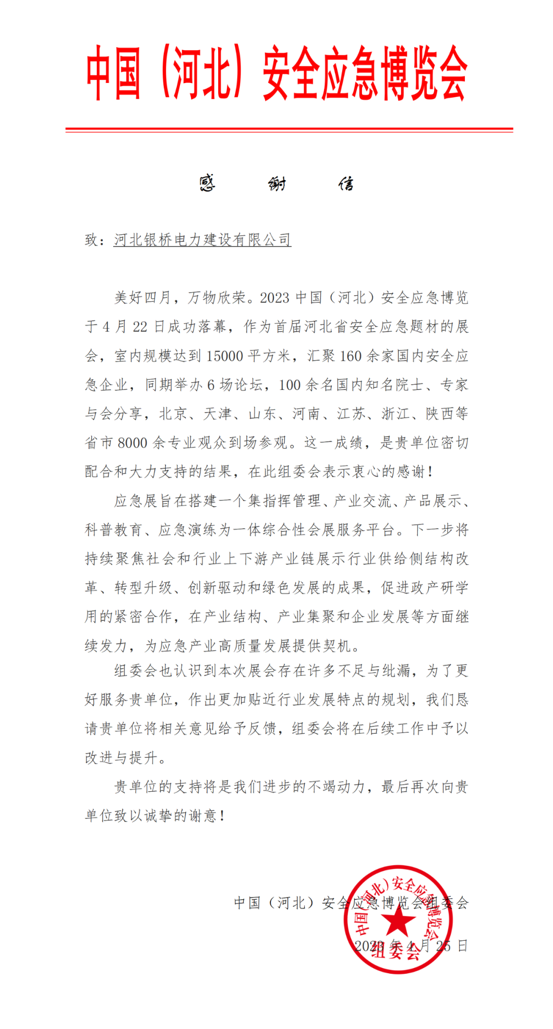 来自中国(河北)安全应急博览会组委会的一封感谢信