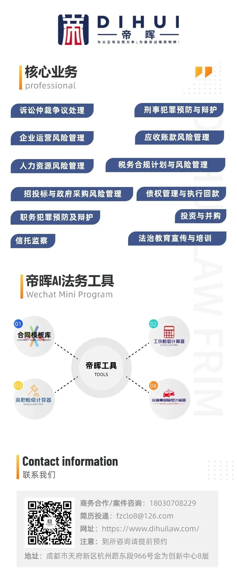帝晖律师事务所政府监管与公共项目法律部深刻理解招投标项目的复杂性与高风险性。我们整合行政法、合同法、诉讼法及刑事合规团队,推出 “标前预防、标中控制、标后保障”三位一体的全流程风险管理解决方案,助您精准投标、合规竞争、稳健盈利。