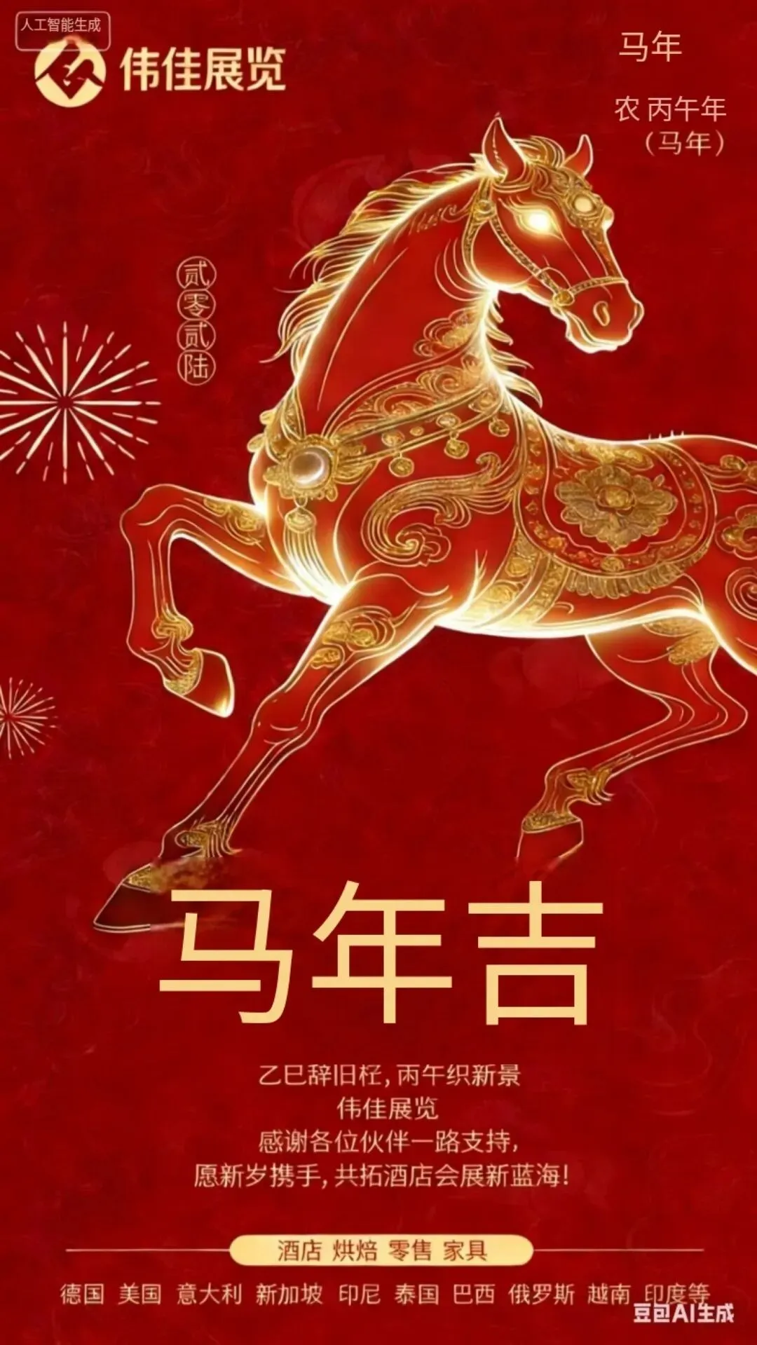 十七载筑梦展会,马年再启新程!岁序更替,华章日新。 值此新春佳节伟佳向长期以来支持我们的合作伙伴和业界同仁致以最诚挚的祝福! 十七载深耕,我们以专业铸就展会标杆; 新岁启航,我们以初心续写行业辉煌。 过去,我们并肩作战,见证万千商机; 马年我们策马扬鞭,共拓广阔蓝海。 祝愿大家: 龙马精神,宏图大展; 生意兴隆,万事胜意! 伟佳展览 敬呈 2026年春节