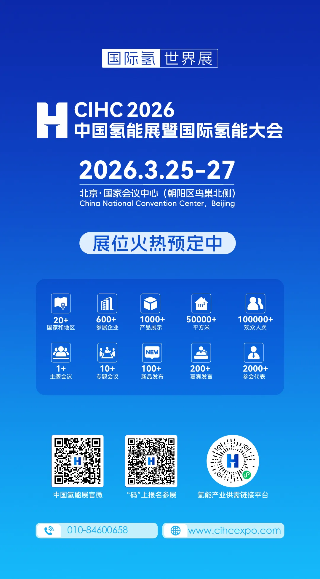 2026中国氢能展暨国际氢能大会(全称:2026中国国际氢能及燃料电池产业展览会暨国际氢能大会,英文全称:China International Hydrogen Congress & Expo 2026, 英文简称:CIHC 2026)由中国氢能联盟、中国电力企业联合会主办,中国建设行业贸促会会展部/北京泰格尔展览有限公司承办,定于2026年3月25日至27日在北京·国家会议中心(朝阳区鸟巢北侧)盛大举办。