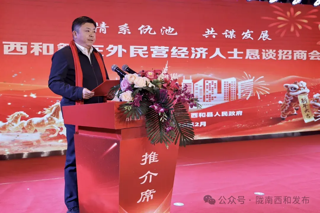 张立平在致辞中代表县委、县政府,向各位乡贤、企业家的到来表示热烈欢迎,向长期以来关心支持西和发展的社会各界人士致以衷心感谢。他说,西和文脉绵长、资源富集、机遇叠加,正处在高质量发展的关键时期,县委、县政府始终把招商引资、民营经济发展作为强县富民的重要抓手,持续优化营商环境、强化要素保障,为大家在西和投资兴业保驾护航。他真诚期盼广大在外民营经济人士常回家看看、多回乡兴业,把先进理念、优质项目、宝贵资源带回西和,携手共创仇池大地发展新辉煌。