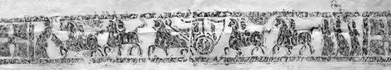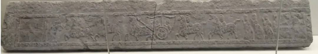 这方现存于汶上县博物馆的汉画像石《车马出行图》,是汉代早期画像石,中间有修复痕迹。此石长157厘米,宽31厘米,厚10厘米,它体量规整,以浮雕的浑厚语言,奏响了一曲穿越两千年的威仪进行曲。