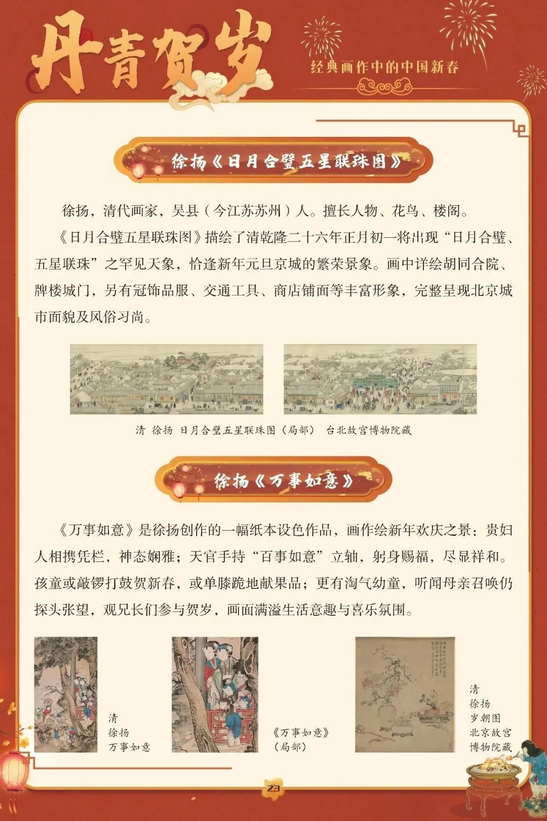 从宋代李嵩《岁朝图》里的案头清供,到清代姚文瀚《岁朝欢庆图》中的庭前笑语;从《雍正十二月令图·正月》的宫苑年俗,到徐扬《万事如意》中的市井欢腾,历代丹青妙手以笔墨为媒,将春联、守岁、祭祖、拜年等新春图景定格于绢素之上、墨笔之间。