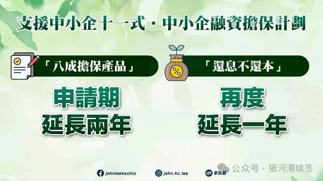 在融资方面,政府将"中小企融资担保计划"下八成担保产品的申请期延长两年,同时将"还息不还本"安排再度延长一年。