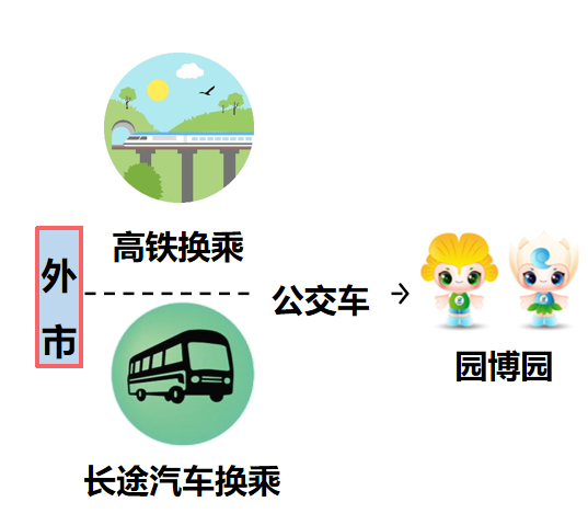 外地乘高铁来连旅客请注意,在高铁站即可乘坐公交园博园专线1号线直达园博园!也可以乘出租车前往。