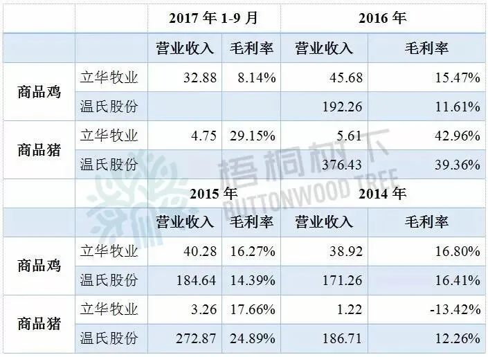 在商品猪上,立华牧业的毛利率经历了大幅的上涨,到2016年也已超过了温氏股份。