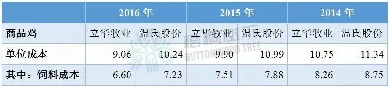 以立华牧业最核心收入来源商品鸡为例,在2014-2016年间,立华牧业单位产品成本均低于温氏股份,而最大影响则来自于饲料成本的明显偏低。