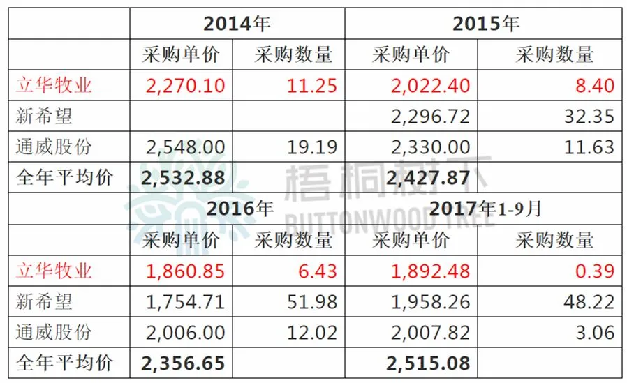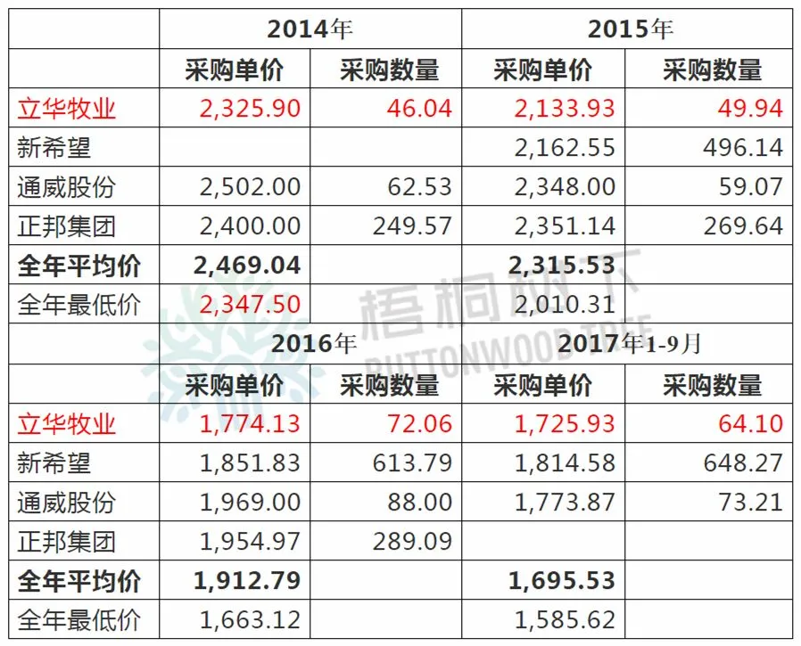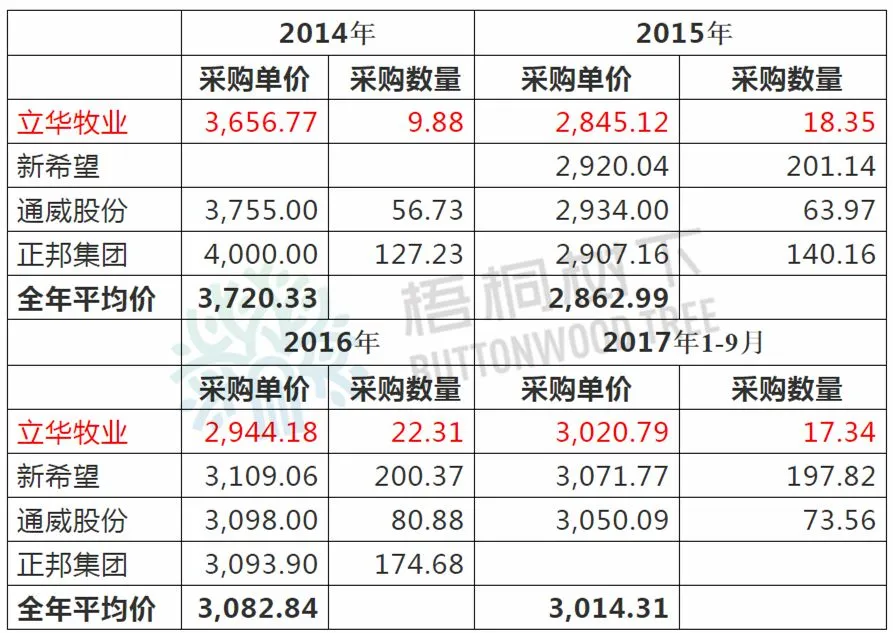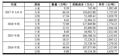 根据立华牧业招股说明书199页显示,其三年一期的原材料采购价格如下: