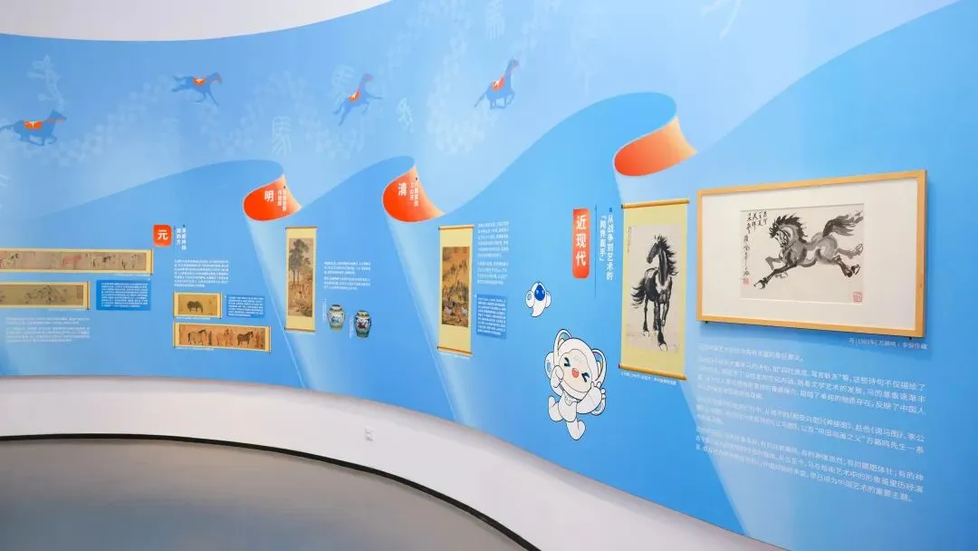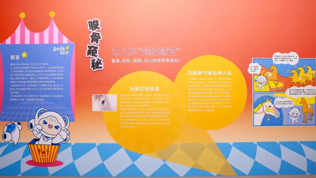 这些“冷知识”,我们一改传统展板的严肃面孔,用大量生动可爱的动漫插画、分格漫画来呈现。以馆内吉祥物“云小漫”的视角展开对话、还原场景,把马的生理构造、感官奥秘与历史故事,全都变成了一本看得见、看得懂的“漫画绘本”。学习知识,就像在翻阅一本精彩的故事书。