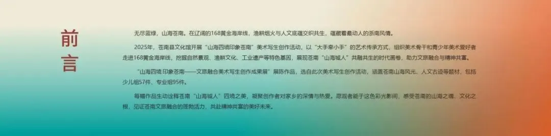 无尽蓝绿,山海苍南。在辽阔的168黄金海岸线,渔耕烟火与人文底蕴交织共生,蕴藏着最动人的浙南风情。2025年,苍南县文化馆开展“山海四境印象苍南”美术写生创作活动,以“大手牵小手”的艺术传承方式,组织美术骨干和青少年美术爱好者走进168黄金海岸线,挖掘自然景观、渔耕文化、工业遗产等特色基因,展现苍南“山海城人”共融共生的时代画卷,助力文旅融合与精神共富。