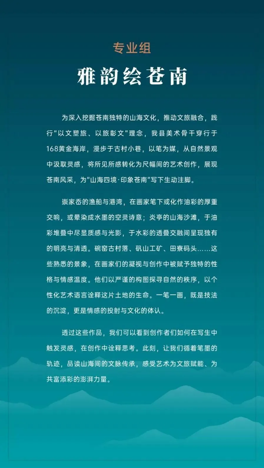 每幅作品生动诠释苍南“山海城人”四境之美,凝聚创作者对家乡的深情与热爱。愿观者能于这色彩光影间,感受苍南的山海之魂、文化之根,见证苍南文旅融合的蓬勃活力,共赴精神共富的美好未来。