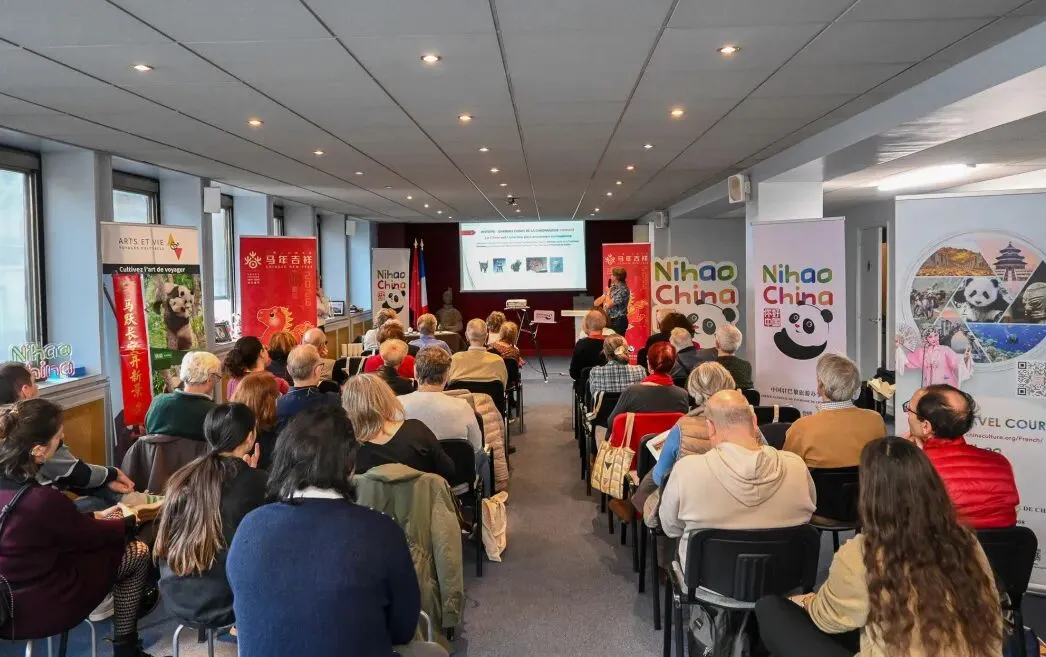 随后,Arts et Vie 旅行陪同、主讲嘉宾 Jacques Durant 以“中国艺术与文化”为主题展开分享。在简要概述中国文化总体脉络的基础上,他首先从中国建筑切入,结合风水理念解读传统空间秩序与“天—地—人”关系,并以古代园林为例阐释中式美学的造园方法与审美追求;继而系统梳理中国绘画从古到今的发展,重点讲解山水画、人文题材与水墨画的核心表达方式及其背后的审美观念。结合“山水意境”这一线索,主讲进一步将文化理解延伸到具体旅行场景,提及中国冬季山川雪景与冰雪主题旅行在观景、摄影与在地体验层面的独特吸引力;随后他延伸至京剧等戏曲艺术,并结合传统乐器展示中国声音文化的意境表达。在传统之外,主讲亦以电影文化作为当代叙事窗口,说明中国如何在现代媒介中呈现传统母题与现代生活;最后回到语言文字与文学,介绍汉字与文化思维的关联,并以《三国演义》等四大名著为代表梳理文学经典的叙事魅力,同时引用李白、杜甫等诗歌传统作为“中国文化精神”的集中体现。