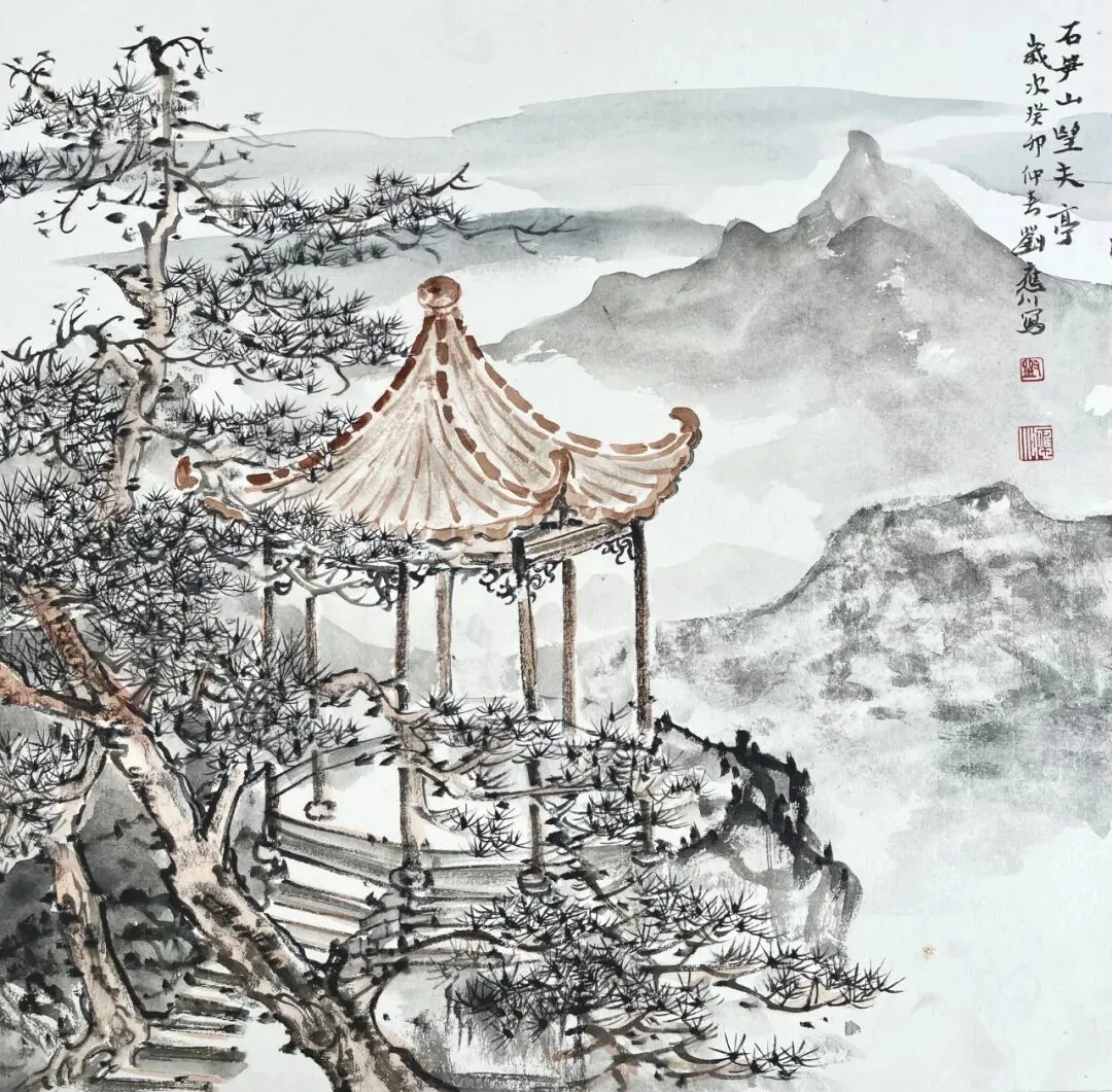 刘应川 《石笋山望夫亭》中国画 37x37cm